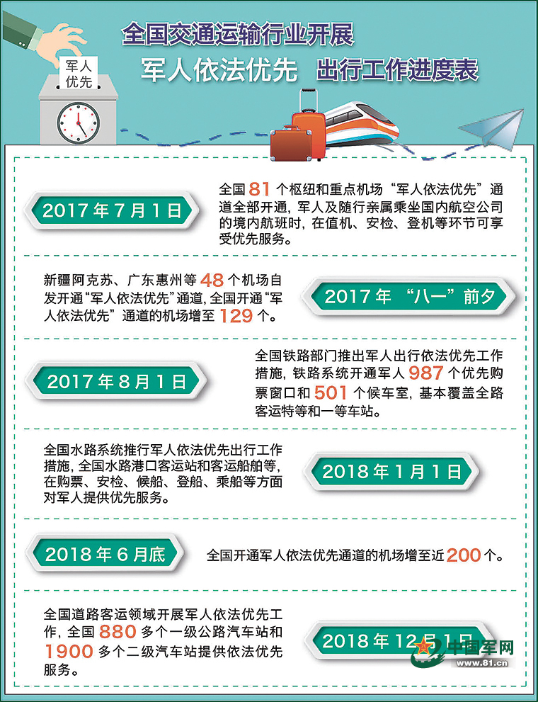 自2017年以來(lái),全國(guó)民航、鐵路、水路系統(tǒng)陸續(xù)推行軍人依法優(yōu)先工作。在中國(guó)民用航空局和軍委后勤保障部的共同指導(dǎo)下,全國(guó)各機(jī)場(chǎng)主動(dòng)作為,把開(kāi)通軍人依法優(yōu)先通道作為一項(xiàng)政治任務(wù),克服各種困難,采取多種措施,深化優(yōu)化細(xì)化為兵為戰(zhàn)服務(wù),參與的機(jī)場(chǎng)從最初的81個(gè)發(fā)展到近200個(gè),先后為過(guò)往軍人開(kāi)通值機(jī)、安檢、候機(jī)、登機(jī)全過(guò)程優(yōu)先快行服務(wù)。在中國(guó)鐵路總公司和軍委后勤保障部的協(xié)調(diào)下,鐵路系統(tǒng)在運(yùn)力緊張、場(chǎng)地有限的情況下,在全國(guó)鐵路2200多個(gè)客運(yùn)站中,設(shè)立987個(gè)軍人優(yōu)先購(gòu)票窗口和501個(gè)候車室,基本覆蓋全路客運(yùn)特等和一等車站,特別是全國(guó)主要高鐵站都已開(kāi)通“軍人依法優(yōu)先”通道,初步形成了“購(gòu)票優(yōu)先、進(jìn)站優(yōu)先、候車優(yōu)先、乘車優(yōu)先”的“四優(yōu)先”常態(tài)保障機(jī)制。今年1月1日起,全國(guó)水路系統(tǒng)推行軍人依法優(yōu)先出行工作,全國(guó)水路客運(yùn)經(jīng)營(yíng)企業(yè)、港口客運(yùn)站和載客12人以上的客運(yùn)船舶等,在購(gòu)票、安檢、候船、登船、乘船等方面對(duì)軍人提供優(yōu)先服務(wù)。