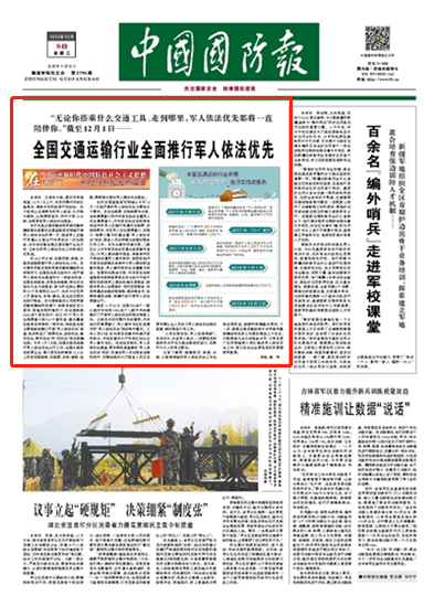 “無(wú)論你搭乘什么交通工具、走到哪里,軍人依法優(yōu)先都將一直陪伴你。”今年1月1日起,全國(guó)水路系統(tǒng)推行軍人依法優(yōu)先出行工作,全國(guó)水路客運(yùn)經(jīng)營(yíng)企業(yè)、港口客運(yùn)站和載客12人以上的客運(yùn)船舶等,在購(gòu)票、安檢、候船、登船、乘船等方面對(duì)軍人提供優(yōu)先服務(wù)。這次全國(guó)道路客運(yùn)領(lǐng)域從今年12月1日起開(kāi)展的軍人依法優(yōu)先主要有以下要求。請(qǐng)關(guān)注今日出版的《中國(guó)國(guó)防報(bào)》的詳細(xì)報(bào)道——