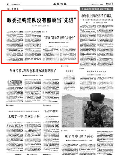 以往,個(gè)別單位評選“先進(jìn)連隊(duì)”時(shí)會對“領(lǐng)導(dǎo)掛鉤幫建”和“取得明顯進(jìn)步”的連隊(duì)優(yōu)先照顧,一方面是鼓勵(lì)后進(jìn)連隊(duì),另一方面是照顧領(lǐng)導(dǎo)面子。殊不知,這樣只會把好事辦成壞事,影響官兵“扛紅旗、爭第一”的積極性。請關(guān)注今日《解放軍報(bào)》的報(bào)道——