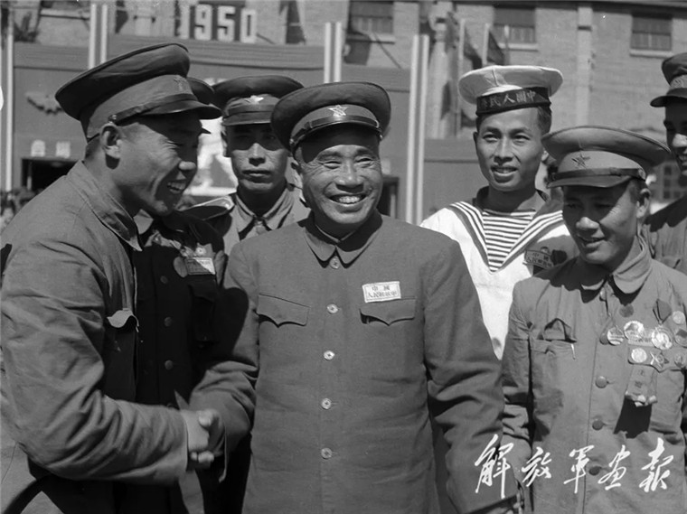 1950年9月,朱德與戰(zhàn)斗英雄在一起。