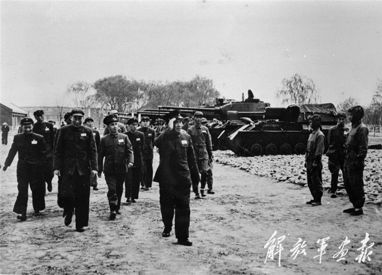 1952年4月,朱德在粟裕陪同下視察裝甲兵部隊(duì)。