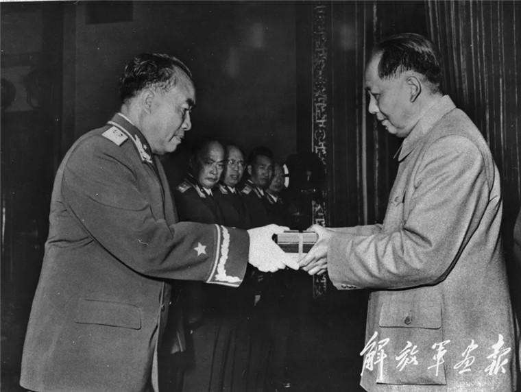 1955年9月27日,朱德接受毛澤東主席授勛。