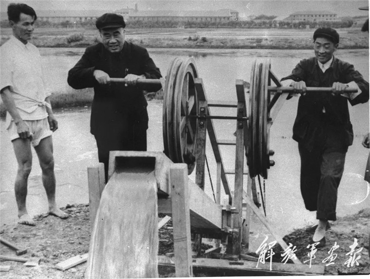 1958年,朱德在安徽省合肥市郊區(qū)操作社員自制的手搖抽水機(jī)。