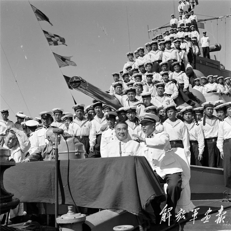 1959年6月,朱德視察海軍,與水兵們合影。