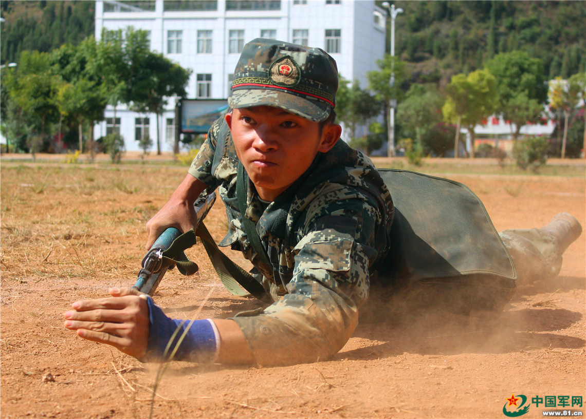 單兵戰(zhàn)術訓練,新戰(zhàn)士臥倒、出槍前進,動作一氣呵成。