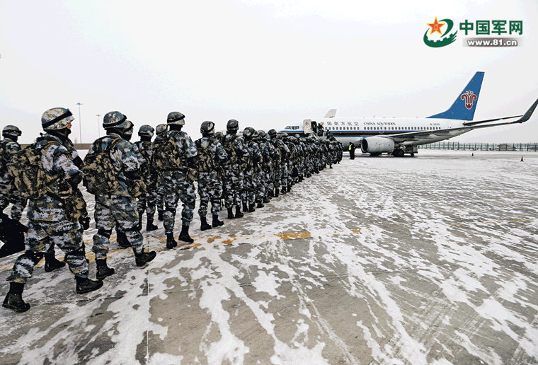 2016年1月,海軍陸戰(zhàn)隊官兵在西部戈壁大漠完成演訓(xùn)任務(wù)后,從新疆庫爾勒機(jī)場乘坐民航客機(jī)回撤。岱天榮攝