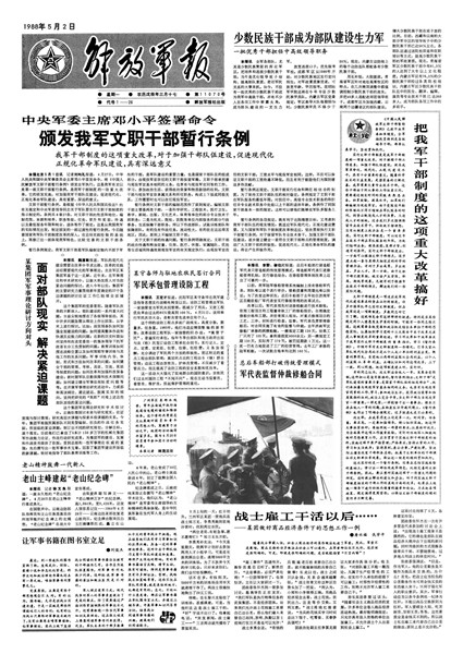 1988年4月27日,中央軍委頒發(fā)《中國人民解放軍文職干部暫行條例》。實行文職干部制度在人民解放軍的歷史上是第一次,是對軍隊干部制度的一項重大改革。
