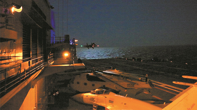殲-15艦載戰(zhàn)斗機進行夜間阻攔著艦訓(xùn)練。胡善敏攝