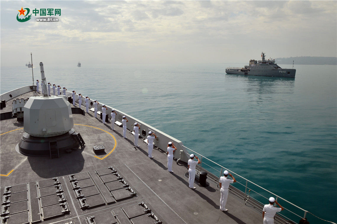 蕪湖艦官兵在閱艦式上行舉手禮,向“朱古達”號近海巡邏艦致敬。張海龍攝