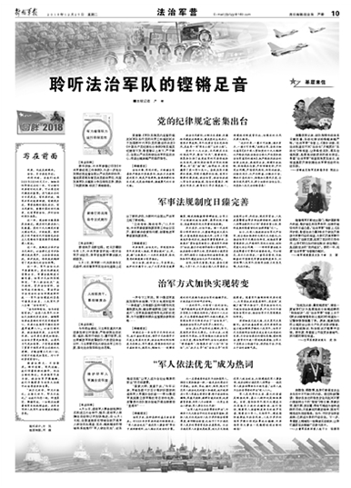 這一年,軍隊(duì)法治化水平顯著提升。黨的紀(jì)律規(guī)定密集出臺,軍事法規(guī)制度日臻完善,治軍方式加快實(shí)現(xiàn)轉(zhuǎn)變,“軍人依法優(yōu)先”成為熱詞,官兵法治信仰、法治觀念不斷強(qiáng)化,尊法學(xué)法守法用法的法治環(huán)境逐漸形成……軍隊(duì)法治建設(shè)的答卷可謂亮點(diǎn)紛呈,人民軍隊(duì)步入全新“法治時(shí)間”。