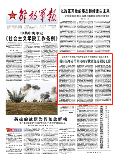 2019年新年春節(jié)即將來臨,退役軍人事務(wù)部、中央軍委政治工作部近日聯(lián)合下發(fā)通知,要求各地各部隊(duì)各部門緊緊圍繞服務(wù)軍地建設(shè)改革,扎實(shí)做好擁軍優(yōu)屬、擁政愛民工作,不斷鞏固堅(jiān)如磐石的軍政軍民團(tuán)結(jié),匯聚強(qiáng)國強(qiáng)軍的磅礴力量。請(qǐng)關(guān)注今日《解放軍報(bào)》的報(bào)道——