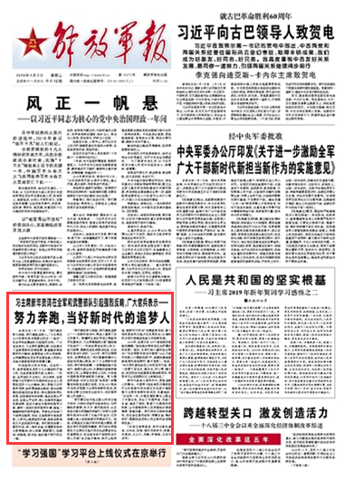 “我們都在努力奔跑,我們都是追夢人。”習(xí)主席在2019年新年賀詞里提出的這一“金句”,在全軍和武警部隊引起強烈反響。廣大官兵表示,習(xí)主席的重要論斷,生動展示了追夢圓夢的宏闊場景,激蕩著改革創(chuàng)新的時代精神,是激勵奮斗的永恒旋律,必將凝聚起全黨全軍全國各族人民同心共筑中國夢強軍夢的磅礴力量。請關(guān)注今天出版的《解放軍報》的報道——