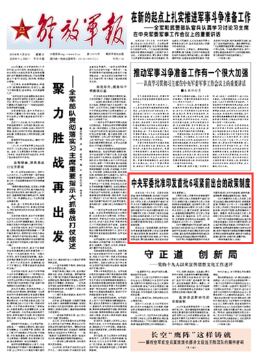 經(jīng)中央軍委批準(zhǔn),有關(guān)部門日前印發(fā)《軍隊(duì)文職人員聘用合同管理暫行規(guī)定》、《軍隊(duì)文職人員管理若干規(guī)定(試行)》等首批6項(xiàng)緊前出臺的政策制度。請關(guān)注今天出版的《解放軍報(bào)》的報(bào)道——