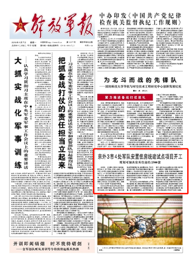 新年前夕,位于青島、濟南、成都3個城市的4處軍隊安置住房統(tǒng)建試點項目相繼開工,4個項目展開建設總規(guī)模近42萬平方米,規(guī)劃可解決官兵住房約2500套。這標志著軍委首批定點的京外安置住房統(tǒng)建試點任務經(jīng)過前期繁重復雜的籌備工作階段,正在全面轉入施工,承載廣大官兵“安居夢”的藍圖即將落地。請關注今日《解放軍報》的報道——
