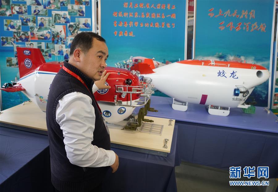 在中船重工第七〇二研究所,葉聰在“蛟龍?zhí)枴薄吧詈S率俊碧?hào)模型前介紹情況(2018年12月24日攝)。 新華社記者 季春鵬 攝