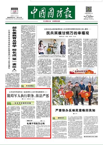 近日,山東省東阿縣人民法院公開宣判了一起阻礙軍人執(zhí)行職務(wù)案件,被告人王某因犯阻礙軍人執(zhí)行職務(wù)罪,被判處有期徒刑一年。該案引起媒體廣泛關(guān)注。請關(guān)注今日《解放軍報(bào)》的報(bào)道——