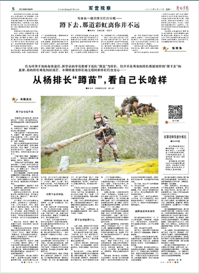 長話短說,對照楊排長的“蹲苗”經(jīng)歷,我們期待每一名排長都能夠認真思量:苗該怎么蹲?基層怎么干?將來怎么辦?同時,各級領導也要及時靠上去多幫帶,給他們搭舞臺,讓他們有平臺,從而凝聚起強軍興軍的不竭力量。