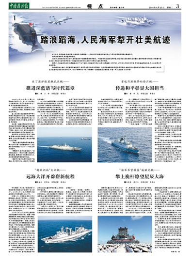 推動建設持久和平、共同繁榮的和諧世界,是世界各國人民的共同愿望。這些明星艦艇遠航深藍的世界航跡,描繪出的中國海軍走向深海大洋的壯美場景,表達的是人民海軍全體官兵的共同心聲。在這個特殊的日子里,本報擷取一組戰(zhàn)艦航跡以饗讀者,并道一聲:人民海軍,生日快樂!