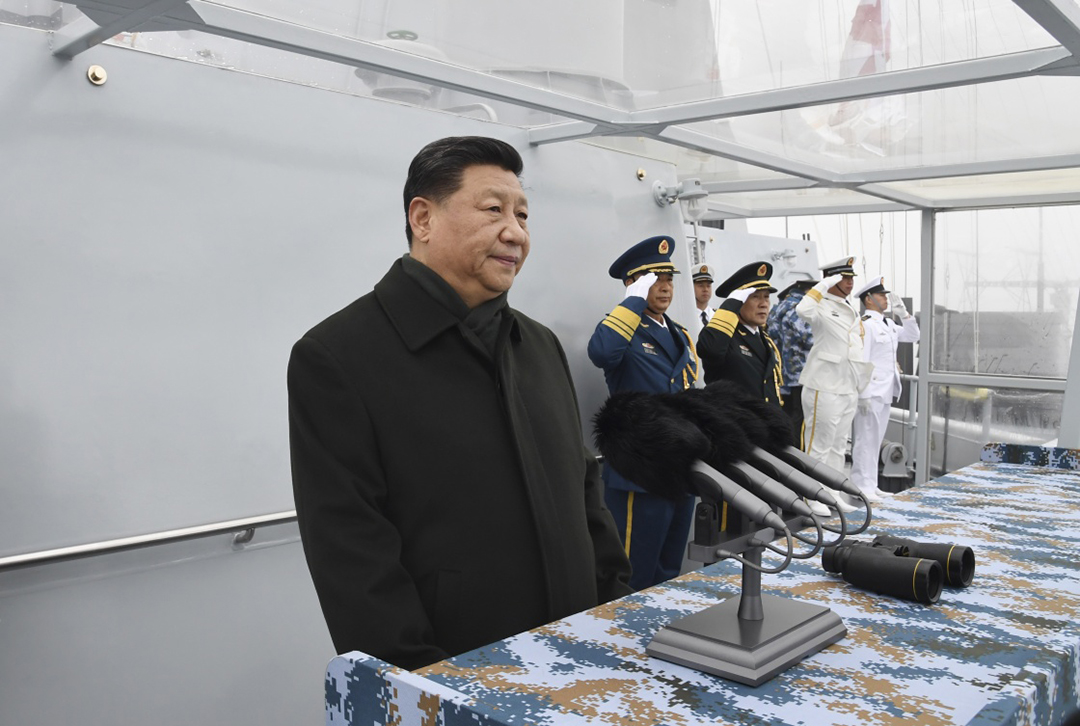 4月23日,在中國人民解放軍海軍70華誕之際,中共中央總書記、國家主席、中央軍委主席習(xí)近平出席在青島舉行的慶祝人民海軍成立70周年海上閱兵活動。圖為習(xí)近平檢閱艦艇編隊。新華社記者 李剛 攝