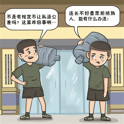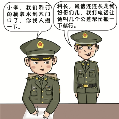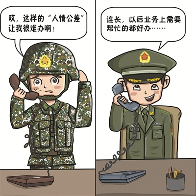 然而,郝小兵在基層走訪了解到,派遣公差的流程規(guī)范了、審批嚴(yán)格了,一些不合理的“人情公差”卻又粉墨登場、層出不窮:打著“好兄弟”“老熟人”的旗號,私底下向基層營連主官“借兵辦事”者有之;喊著“都是一家人”,向原單位“伸手動兵”者亦有之;更有甚者,拿著“雙爭評比加分”當(dāng)令箭,和基層搞交換。