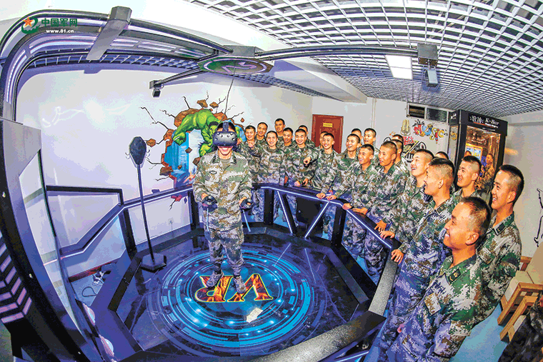 周末,新疆軍區(qū)某師官兵暢玩VR游戲。李仁錫攝