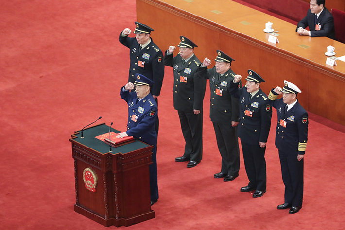根據《第十三屆全國人民代表大會第一次會議主席團關于憲法宣誓的組織辦法》,中華人民共和國中央軍事委員會副主席許其亮、張又俠,委員魏鳳和、李作成、苗華、張升民進行憲法宣誓。