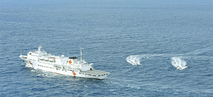 當(dāng)?shù)貢r(shí)間7月4日上午,赴大洋洲、中南美洲執(zhí)行“和諧使命-2018”任務(wù)的中國(guó)海軍和平方舟醫(yī)院船,在航渡期間舉行了一場(chǎng)全員額、全要素、全流程的海空立體醫(yī)療救護(hù)與后送演練。