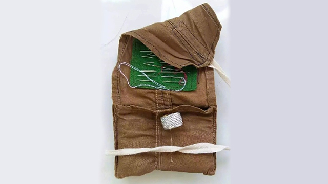 軍黃色的外表,極簡的樣式,幾縷細線深藏,幾枚銀針閃耀。它陪伴我走過了五十三年的光陰,與我形影相隨,跟我南征北戰(zhàn)。