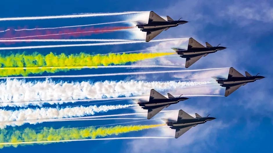 這是殲-20首次在公開飛行中展示四機編隊和內(nèi)載掛彈能力,震撼獻禮人民空軍成立69周年紀念日。
