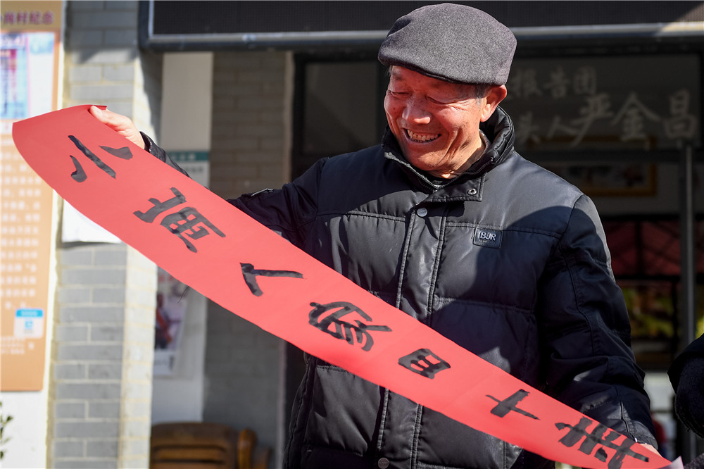 嚴(yán)金昌在家門(mén)口展示春聯(lián)。