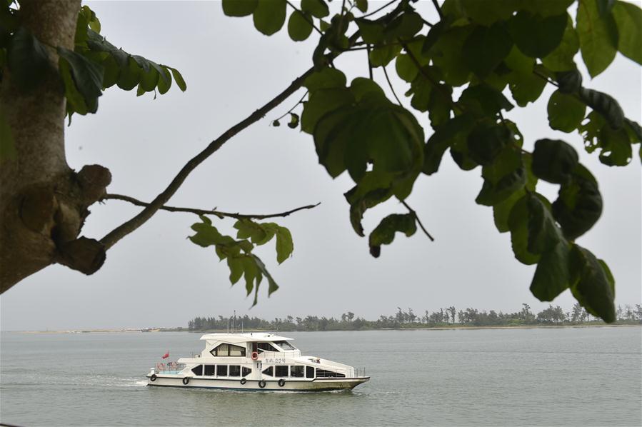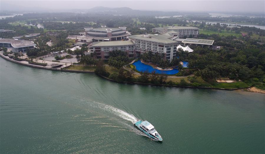 3月13日,游人乘船在博鰲亞洲論壇永久會(huì)址景區(qū)附近海域游覽(無(wú)人機(jī)拍攝)。新華社記者楊冠宇攝