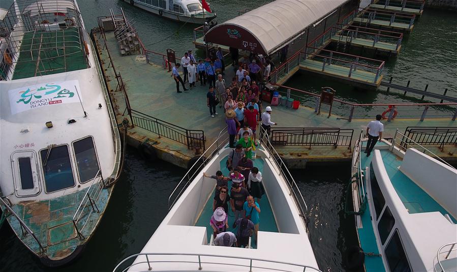 3月13日,游人在博鰲亞洲論壇永久會(huì)址景區(qū)內(nèi)碼頭登上游船(無(wú)人機(jī)拍攝)。新華社記者楊冠宇攝