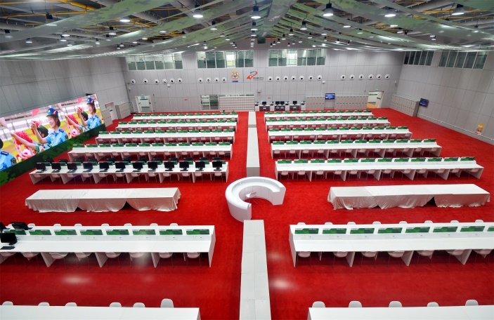 在主媒體中心一樓正中的媒體工作間,350個(gè)工位整齊排開,兩層樓的空間高度,加上頂部成排的波浪形軍綠色橫幅,令媒體工作間寬敞宏闊。這里一次可供240位文字記者、96位攝影記者同時(shí)工作,物業(yè)、安保24小時(shí)工作。媒體工作間服務(wù)臺(tái)可租借攝影、攝像設(shè)備;墻邊數(shù)百個(gè)小格子里,賽時(shí)將第一時(shí)間放置打印好的每一場的比賽成績,供記者取閱。