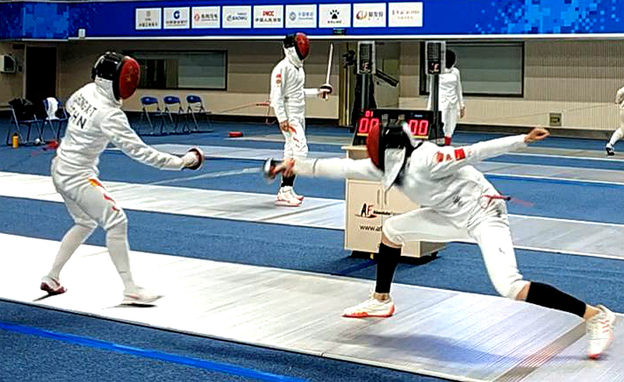 八一現(xiàn)代五項(xiàng)隊(duì)隊(duì)員正在進(jìn)行擊劍訓(xùn)練