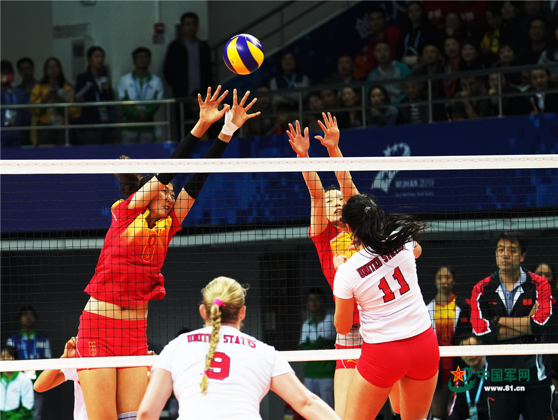 10月16日,第七屆世界軍人運(yùn)動(dòng)會(huì)首個(gè)體育比賽日,中國(guó)女排與美國(guó)女排的首場(chǎng)小組賽上,中國(guó)八一女排3比0戰(zhàn)勝美國(guó)女排。柳軍攝