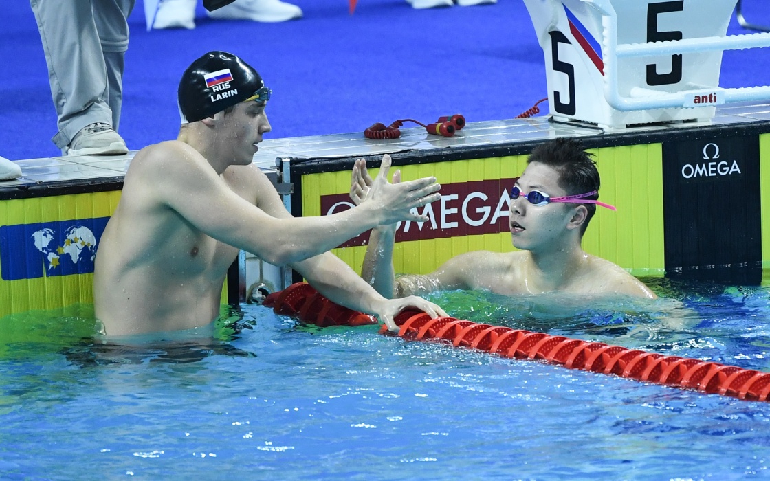 10月19日,中國選手李廣源(右)在比賽后慶祝。新華社記者 程敏 攝