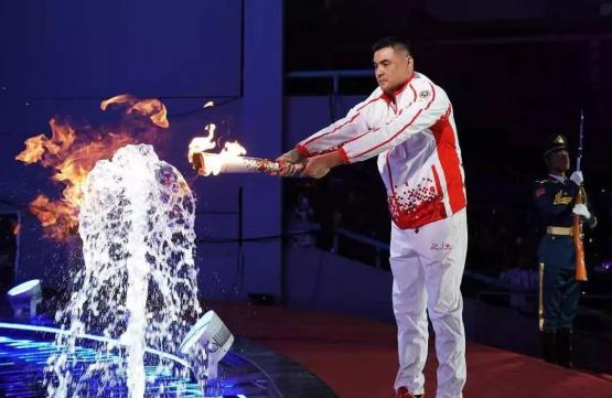 萬眾矚目中,籃球運(yùn)動(dòng)員劉玉棟踏上各國軍人運(yùn)動(dòng)員用不同語言書寫的“和平”字樣臺(tái)階點(diǎn)燃水柱,火焰熊熊燃燒的同時(shí),噴泉依舊泛起水花,數(shù)萬觀眾見證了這一罕見的“水火交融”奇跡。