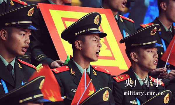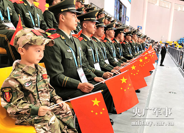 在現(xiàn)場,記者看到了一個最萌“小軍迷”,他身穿迷彩服,手拿小國旗,端正地坐在武警湖北總隊某支隊戰(zhàn)士旁邊,目不轉(zhuǎn)睛地緊盯比賽賽況,給參賽選手加油鼓勁。“小軍迷”時不時還會偷偷看一眼旁邊的武警戰(zhàn)士,并悄悄調(diào)整自己手里小國旗的高度,爭取把國旗和武警戰(zhàn)士手里的國旗保持同一高度,萌萌的小動作引來現(xiàn)場觀眾的注意。比賽途中,爸爸提出帶他吃飯,他搖搖頭執(zhí)意不肯離開。當(dāng)看到中國國旗升起的時候,他立刻從座位上站起來向國旗敬禮。