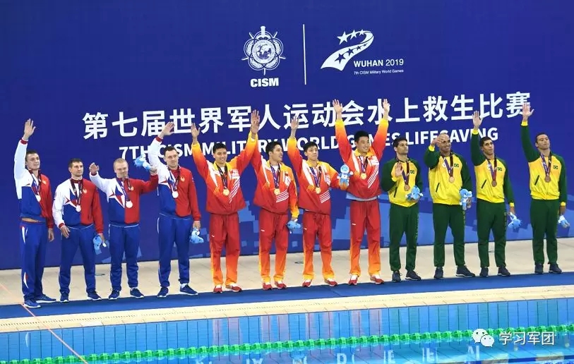 10月22日,中國(guó)隊(duì)奪得水上救生項(xiàng)目男子4×50米混合救生接力決賽冠軍。這是頒獎(jiǎng)儀式后,隊(duì)員們向觀眾致意。 解放軍報(bào)記者穆瑞林 攝