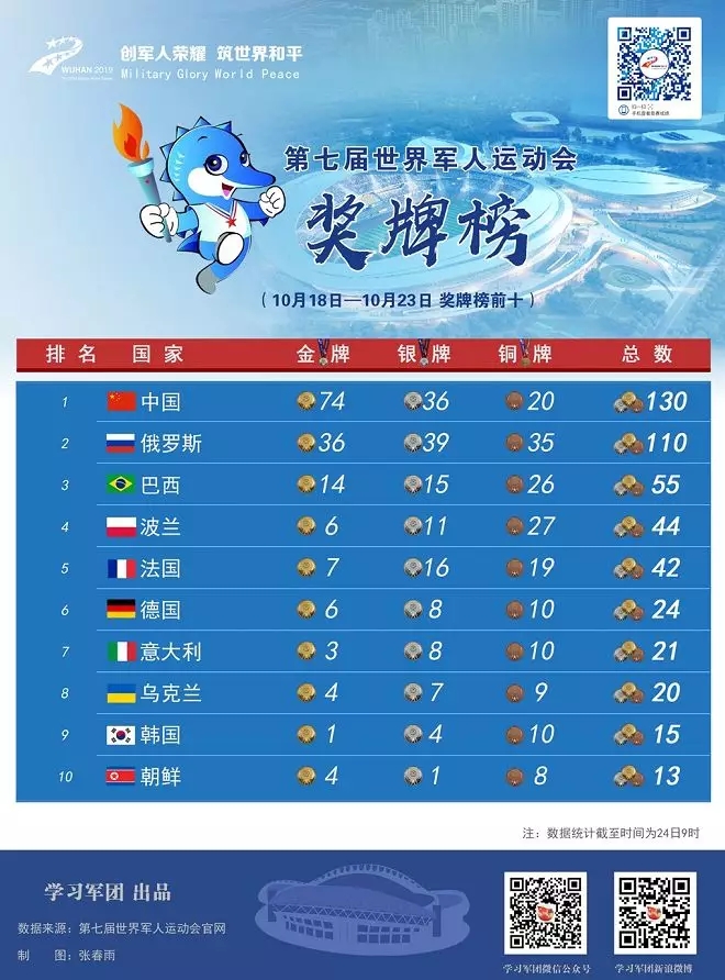 解放軍報(bào)武漢10月23日電(記者賴瑜鴻)軍運(yùn)會(huì)賽程過半,中國(guó)代表團(tuán)繼續(xù)高歌猛進(jìn),再掀奪金熱潮。截至記者發(fā)稿時(shí),中國(guó)代表團(tuán)以73金36銀20銅穩(wěn)居獎(jiǎng)牌榜第一。