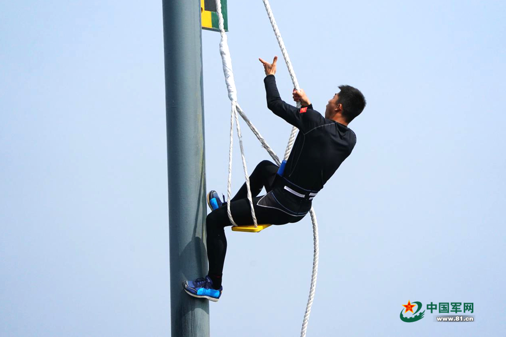 中國隊程奉瑄爬上桅桿。中國軍網(wǎng)記者蘭卓文 攝