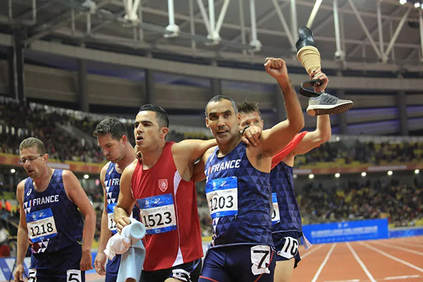 左腿截肢的突尼斯選手吉貝爾在沖過(guò)終點(diǎn)時(shí)