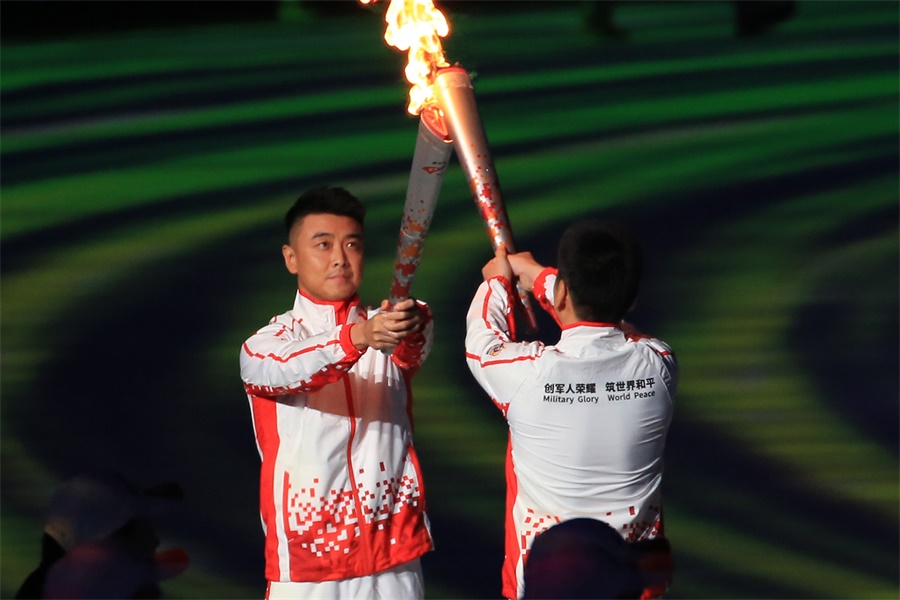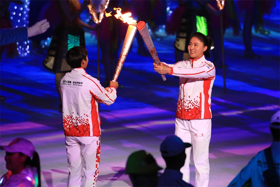 ▲10月18日,第七屆世界軍人運動會開幕式,火炬手在運動場內傳遞軍運圣火(攝影:朱西迪)
