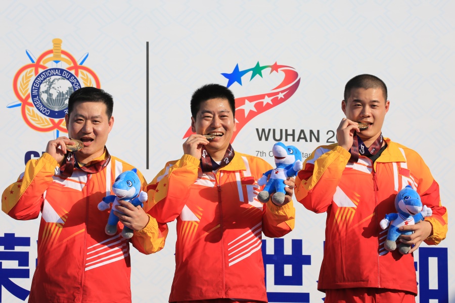 ▲10月19日,蔡甸國防園射擊館,中國選手謝振翔、金泳德、姚兆楠為中國軍團斬獲第七屆世界軍人運動會的首枚金牌(攝影:朱西迪)
