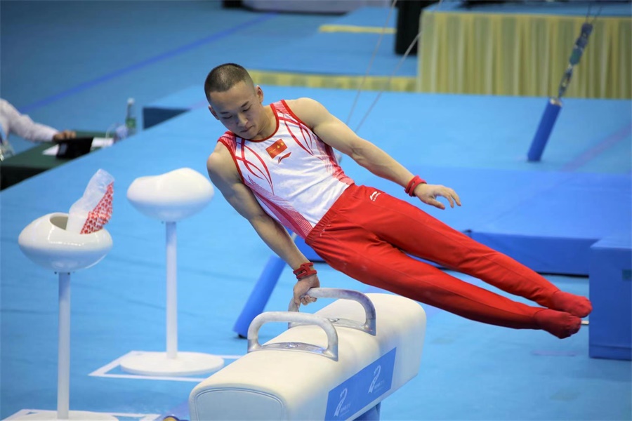 ▲10月21日,湖北省奧林匹克體育中心體育館,運動員肖若騰在體操男子個人全能決賽比賽中奪得冠軍(攝影:謝芳)