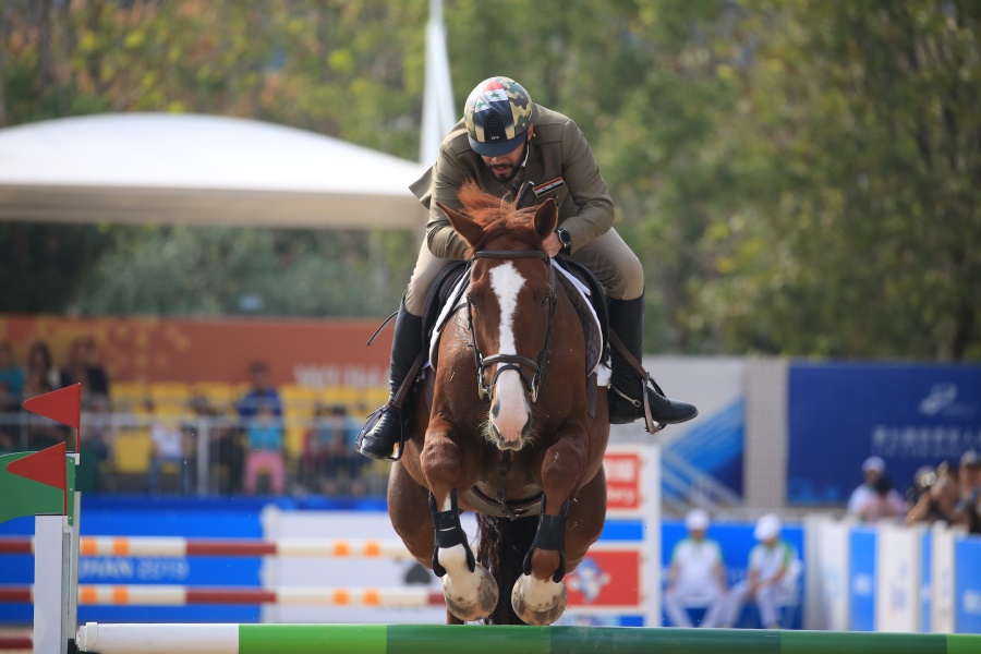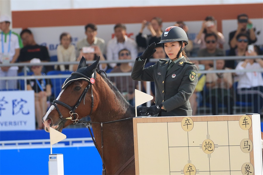 ▲10月21日,武漢商學院馬術場,中國女選手田羽(下士)比賽前向評委和觀眾致敬(攝影:朱西迪)