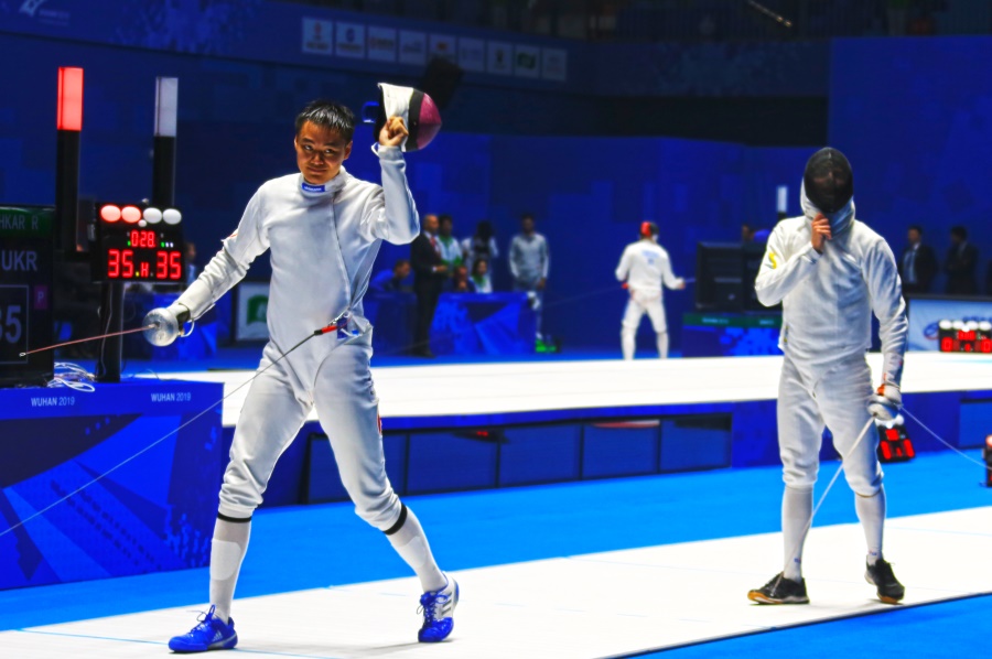 ▲10月23日,武漢城市職業(yè)學院體育館,軍運會擊劍男子重劍團體四分之一比賽中,中國隊最后時刻“決一劍”,36比35戰(zhàn)勝烏克蘭隊,晉級半決賽(攝影:郝錚)