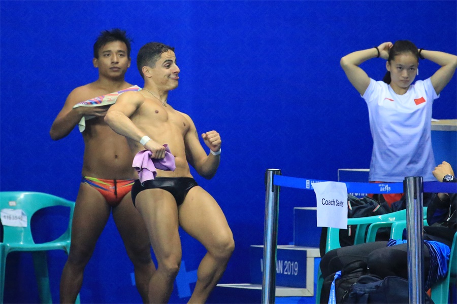 ▲10月24日,武漢體育中心游泳館,男子1米跳板決賽,外國選手完成比賽,舞蹈慶祝(攝影:朱西迪)