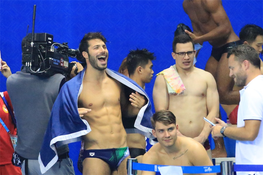 ▲10月24日,武漢體育中心游泳館,男子1米跳板決賽結束后,外國選手成績優(yōu)秀開心大笑(攝影:朱西迪)