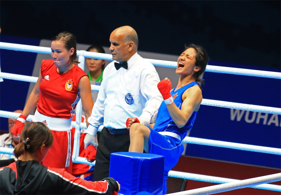 ▲10月25日,武漢體育學院體育館,軍運會拳擊女子54-57公斤級比賽中,中國選手劉飄飄獲得冠軍后興奮吶喊(攝影:郝錚)